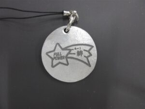 リサイクルアルミを使ったキーホルダーを作るにあたっては、クラス全員でデザインを考えてくれました。このデザインを当センターの佐伯教授がレーザー加工で刻印、世界に一つだけのオリジナルキーホルダーが完成しました。