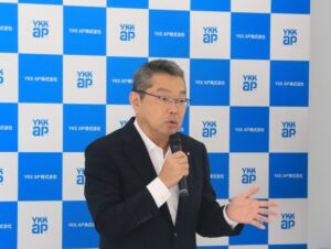 続いて阿部副社長から「当社は富山県を技術の拠点とし、住宅やビル向けの窓・ドアをはじめ、カーポートやフェンスなどのアルミ製品に加え、今後の自動車や家電などの産業用形材への展開を見据え、アルミニウムの特性を活かした製品開発を行っている。環境への責任を果たすべく、リサイクルアルミを含む技術開発にも注力しており、地球環境に配慮した製品づくりを推進している。資源の乏しい日本において、サーキュラーエコノミーを軸とした技術力は重要であり、富山大学と連携し、これまでにないアルミの用途開発にも取り組んでいきたい。」と述べられました。